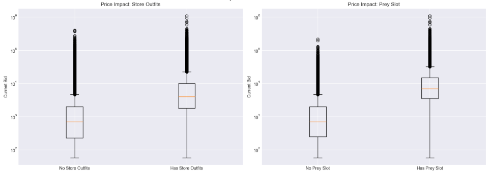 The presence of a Prey Slot drastically narrows the interquartile range (IQR). This suggests a high market consensus on the value of this feature; players focused on efficiency create a stable, high-demand segment that reduces price volatility for these characters.