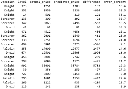 The model achieves near-perfect results in the "standard" high-level character segments, where the correlation between level and market price is most stable: