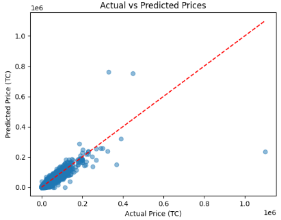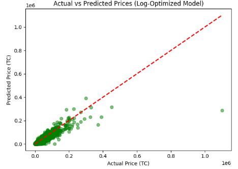 The points adhere much more closely to the ideal prediction line (y = x). The logarithmic transformation effectively eliminates the skewness of the price distribution, making the model better at predicting values across the entire data spectrum.