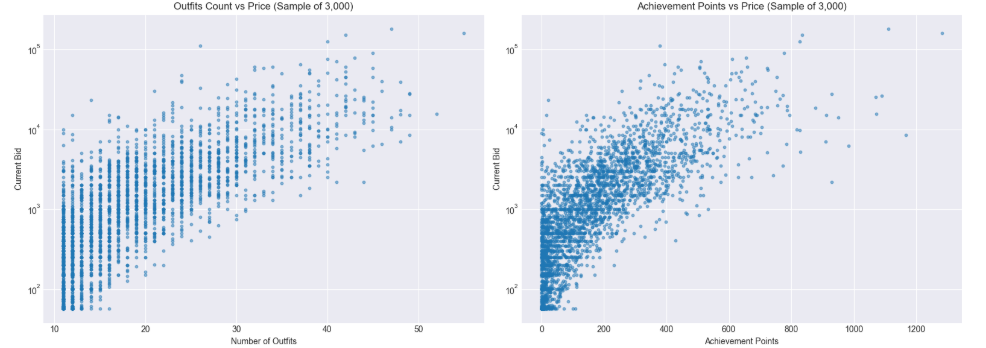 Scatter plots reveal a significant difference in valuation: while Store Outfits show a more stable upward trend, Achievement Points exhibit greater variance. This suggests that the market treats achievements as an elite attribute – high points on characters with low combat potential (level/skill) are not rewarded as strongly as they are for high-end characters, where achievements become a key bidding factor for collectors.