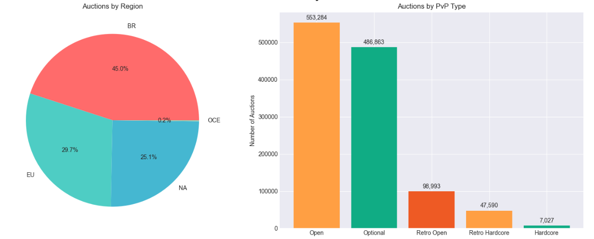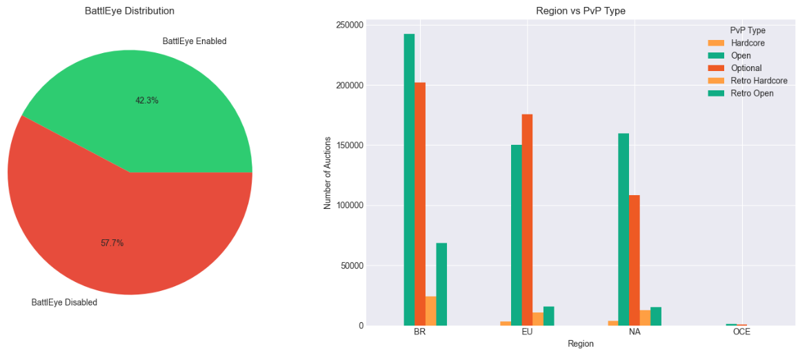 Character valuation in Tibia is a multidimensional process, with location and server type acting as key value multipliers. This part of the analysis focuses on understanding how external factors—such as the PvP system, geographic region, and server experience (BattlEye system)—affect auction liquidity and final prices.