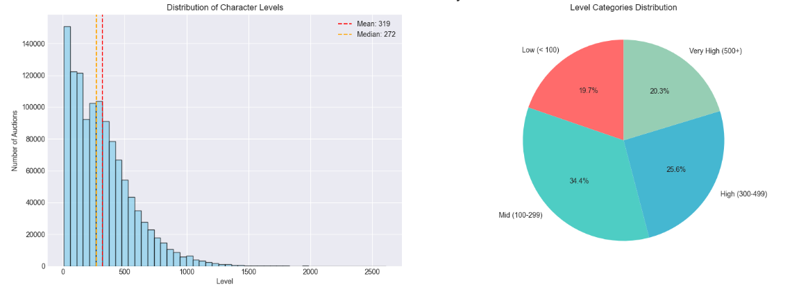 Character level is the most obvious, yet also the most complex, factor influencing price in Tibia. The following analysis sheds light on the demographic structure of the market and the mathematical relationship between game progress and player portfolio value. Examining the level distribution and its correlation with price not only allowed me to understand the heart of the market (the Mid-High segment) but also proved that this relationship is nonlinear. It was here that the decision was made to apply a logarithmic transformation, which became the key to the high precision of my model.