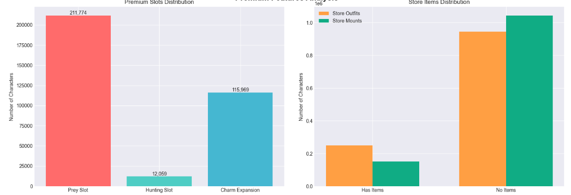 The next step in the analysis was to examine the impact of paid features on the final auction price. In the world of Tibia, items like Charm Expansion, additional Prey slots, and unique mounts and outfits from the Store act as strong multipliers of the base price.
