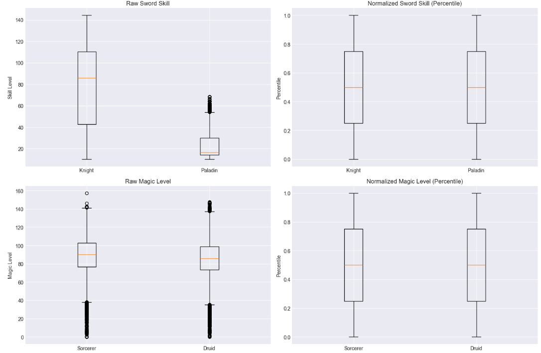 Raw graphs show actual skill levels. We see huge disparities in skill ranges (e.g., Knight's Sword Skill vs. Paladin), making it impossible to fit them into a single model without transformation. Normalized graphs (Percentile) bring all skills to a common scale of 0.0 - 1.0. A value of 0.5 means the character is strictly "average" in their profession. A value of 0.99 means the character is in the top 1% of their profession for a given skill. Thanks to this transformation, the future model will not have to learn the price dependence from zero for each profession separately. Instead, it will receive a clear message: "This character is in the top 5% of their class," which is a strong signal of a price increase (Current Bid), regardless of whether they are Knight or Sorcerer.
