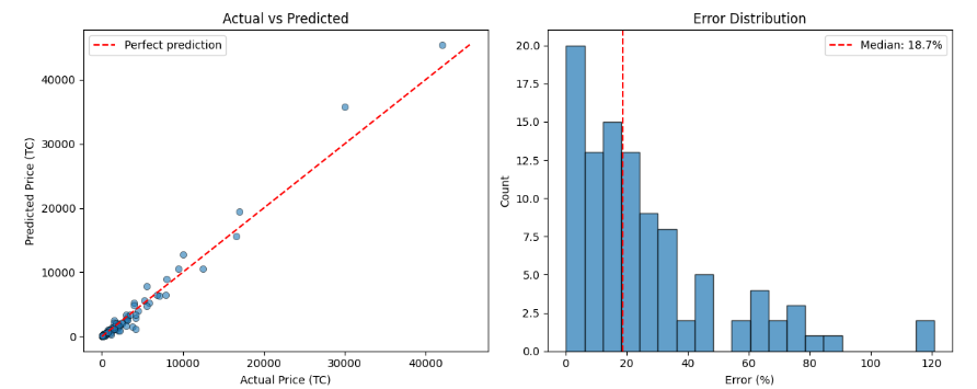 This improvement in model parameters demonstrates that the Tibia Bazaar market operates based on multiplicative logic, not additive logic. In other words, features such as an additional Prey slot or high skill don't add a fixed amount of TC to the price, but rather increase the character's value by a certain percentage. The logarithmic scale allowed the model to more effectively capture these relationships while reducing the impact of extreme values (outliers), resulting in significantly greater prediction accuracy across all price segments.