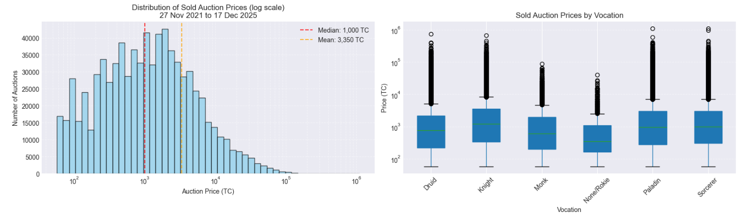 To better understand the financial landscape of the market, I analyzed the distribution of auction prices using a logarithmic scale. This approach is necessary because the Tibia market is highly polarized; while the vast majority of transactions occur at lower price points, a small number of "luxury" auctions reach values in the millions. By using a log scale, we can clearly see the market's center of gravity around the 1,000 TC median, while the gap between the median and the 3,350 TC mean highlights how heavily the top-tier characters influence the overall average.