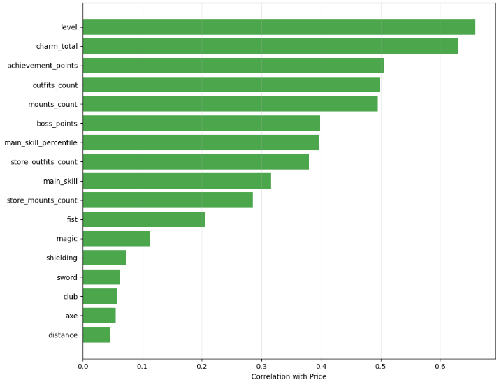 Dominance of progression features: level (0.659) and charm_total (0.631) are the strongest predictors of price. This is logically consistent, as these variables approximate the cumulative time investment and progression intensity associated with a character. Charms, in particular, constitute a high-effort progression subsystem, and their strong association with price indicates that the market internalizes grinding effort into monetary value.