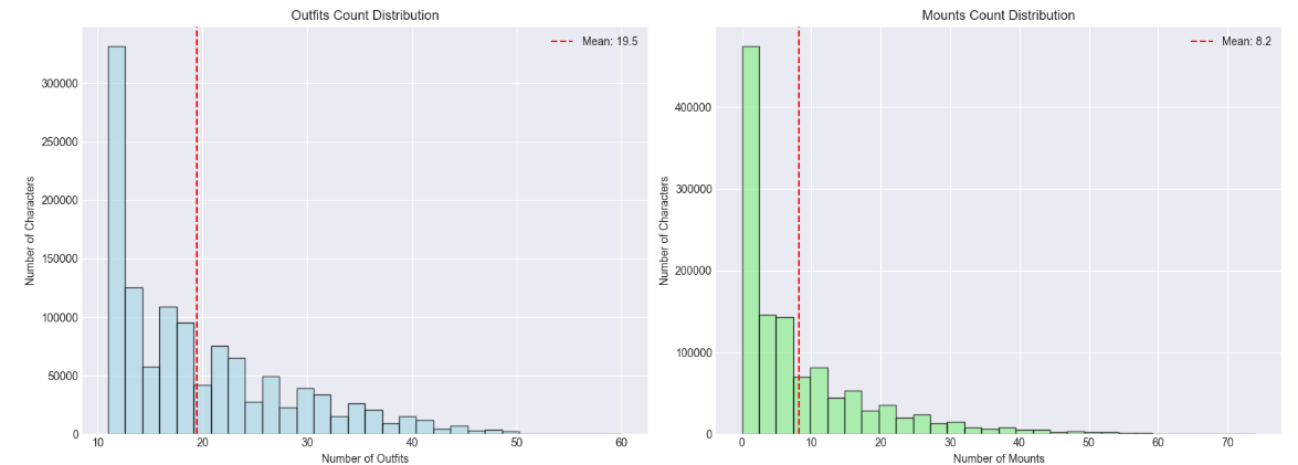 The distributions of outfits and mounts are centered around average values (~19 and ~8, respectively), but long tails in the histograms indicate a "collector" group, where prices can increase exponentially with the number of add-ons owned.