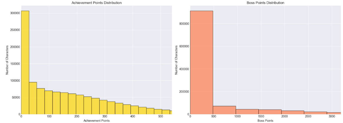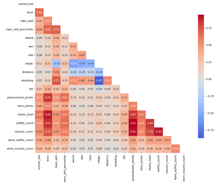 Collection and prestige value: achievement_points, outfits_count, and mounts_count all exhibit moderately strong correlations (approximately 0.50). This suggests the presence of a robust prestige-driven submarket, in which cosmetic and status-oriented attributes significantly influence final transaction prices. These features function as social signaling mechanisms, contributing symbolic capital that is monetized in secondary markets.